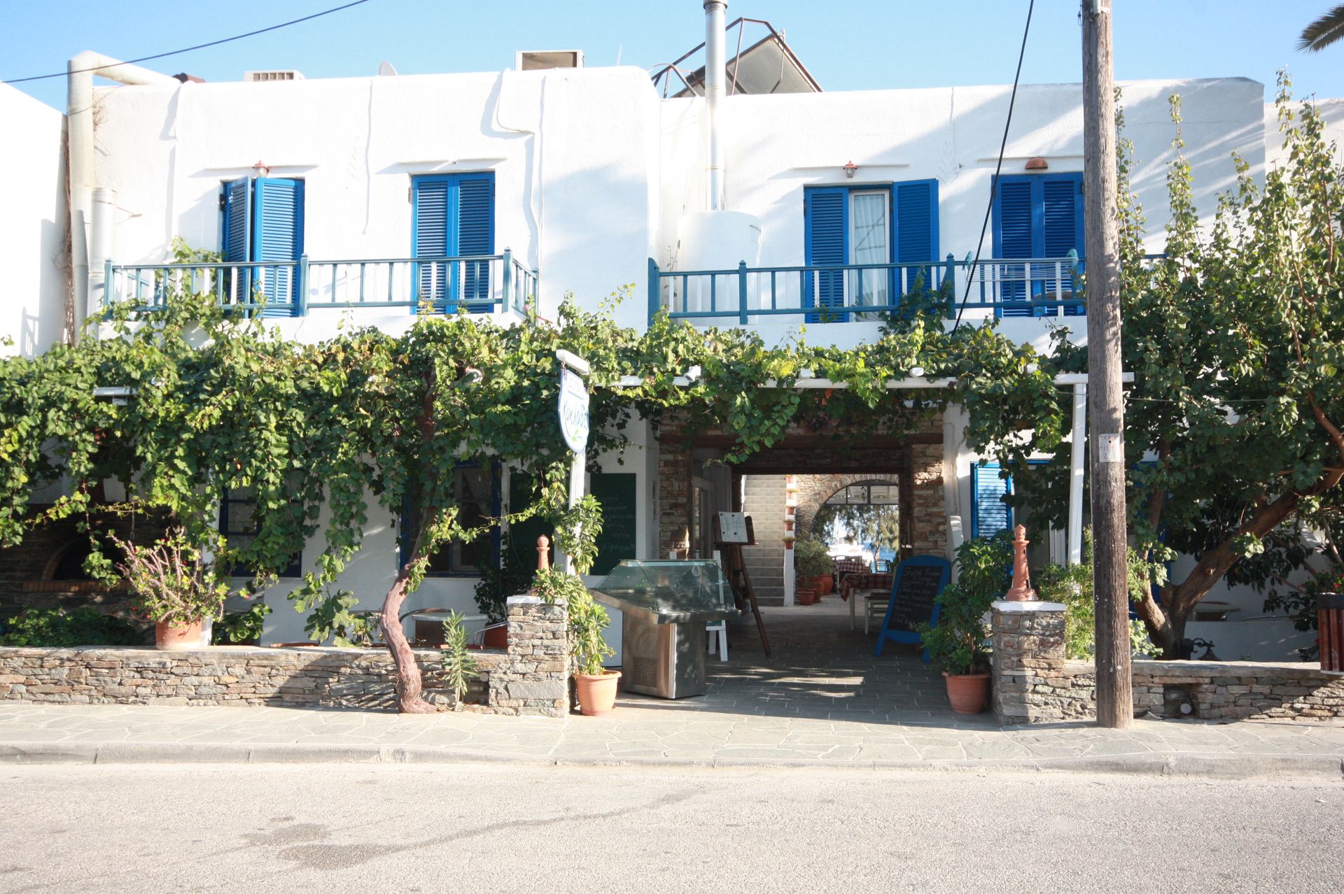 Breakfast is served at the restaurant Cyclades at a common veranda wich has a panoramic view of the beach of Platis Gialos