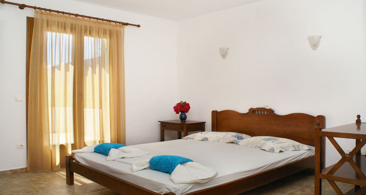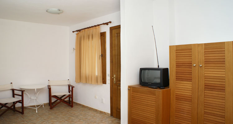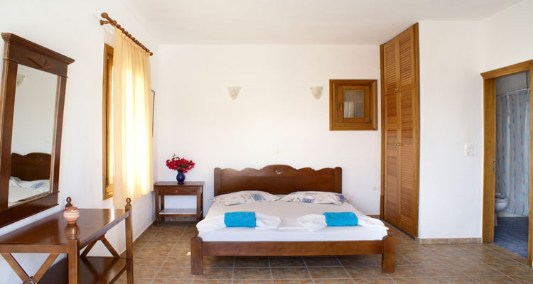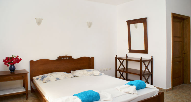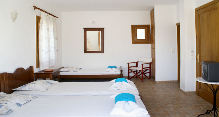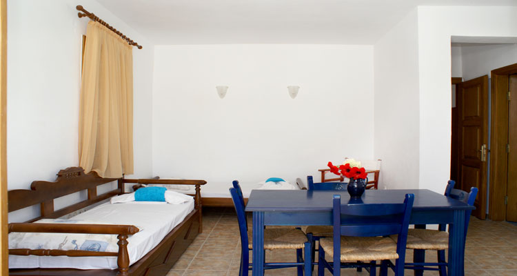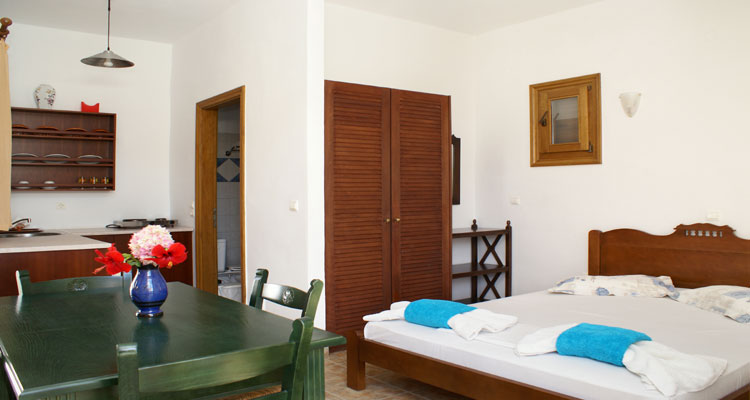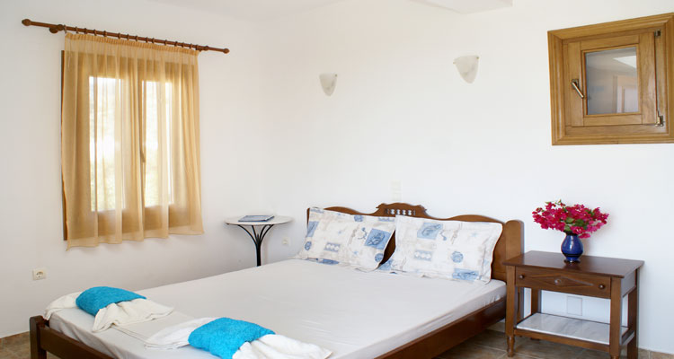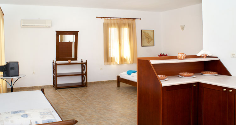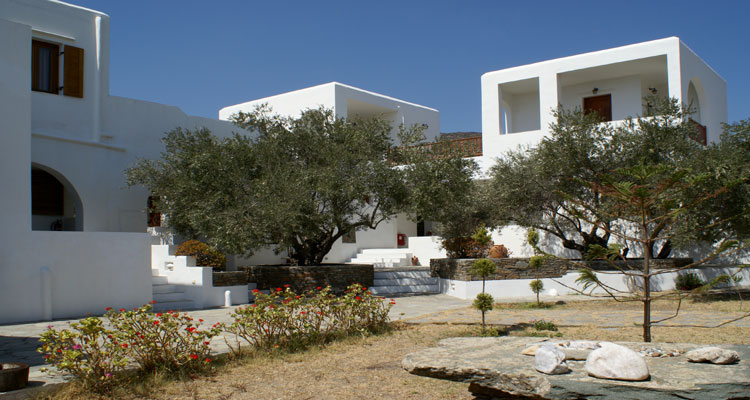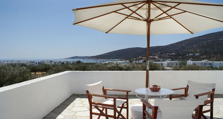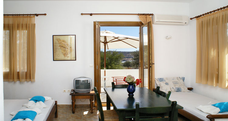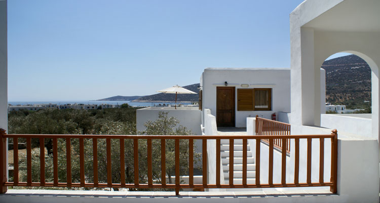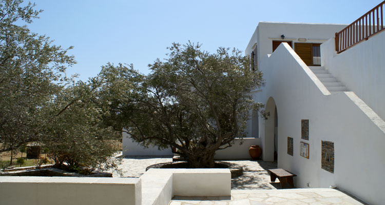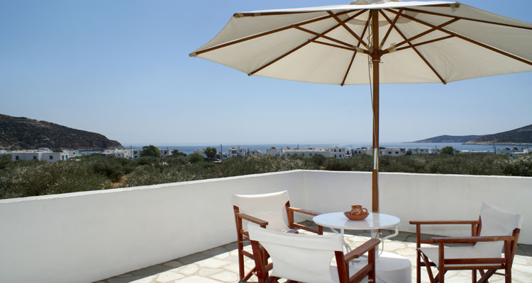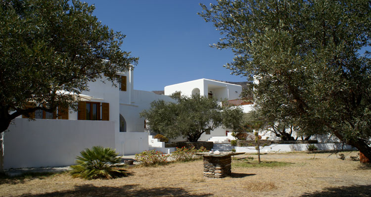 Accommodation FANEROMENI located in Platis Gialos, just a few meters from the blue flag sandy beach. Built in an olive grove, offering shade and plenty of space for guests